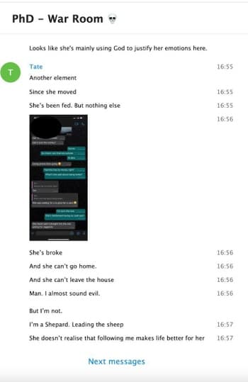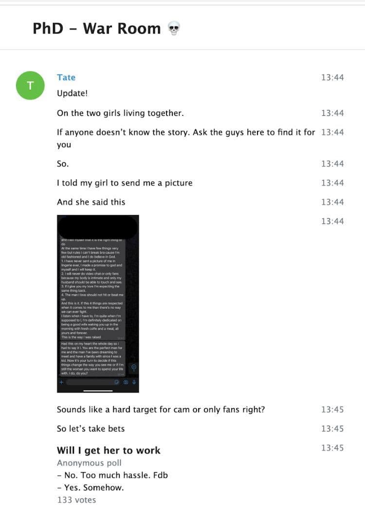Leaked chat logs show Andrew Tate taking bets on whether he can manipulate and exploit a young woman who is resistant to working in his webcam porn company.