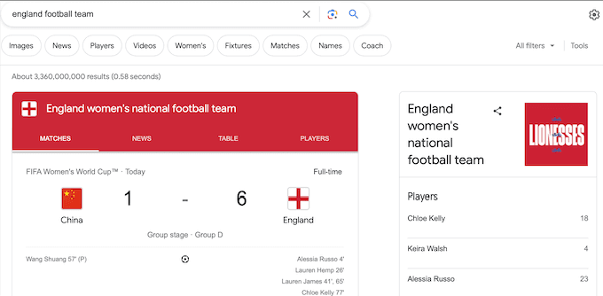 For example, the ‘gender ambiguous’ query, ‘England football team’. And sure enough, the top result is the England Women’s team, and their recent World Cup result.
