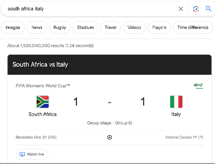 A screenshot of a results page from Google that shows the score of the South Africa v Italy match in the Group stage of the world cup tied at 1-1 during the first half