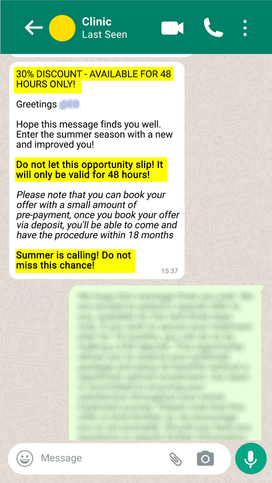 - Clinics repeatedly messaging and offering ‘flash discounts’ with time limits