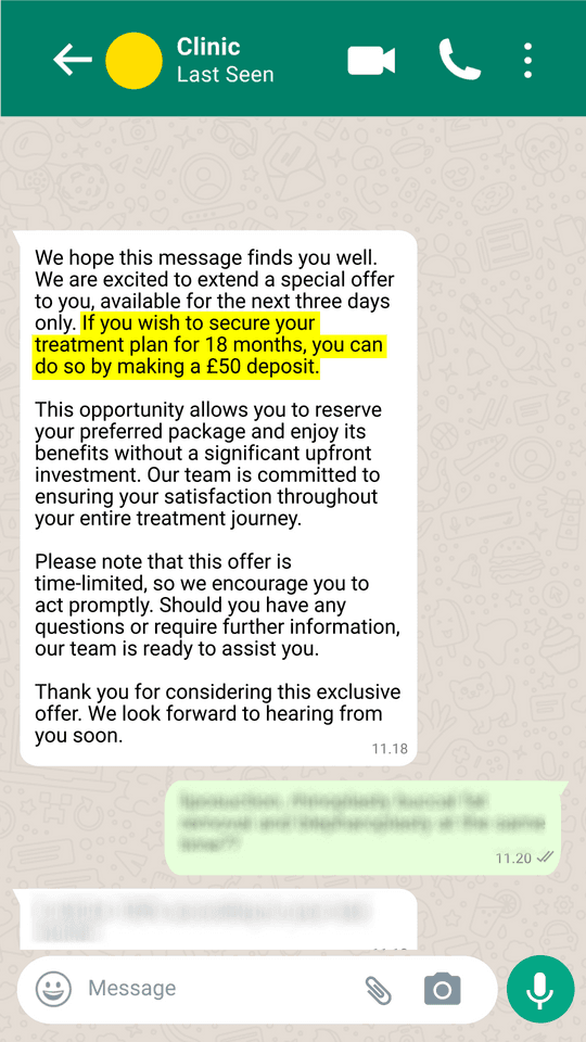 “We are excited to extend a special offer to you, available for the next three days only,” the message read. “If you wish to secure your treatment plan for 18 months, you can do so by making a £50 deposit.”