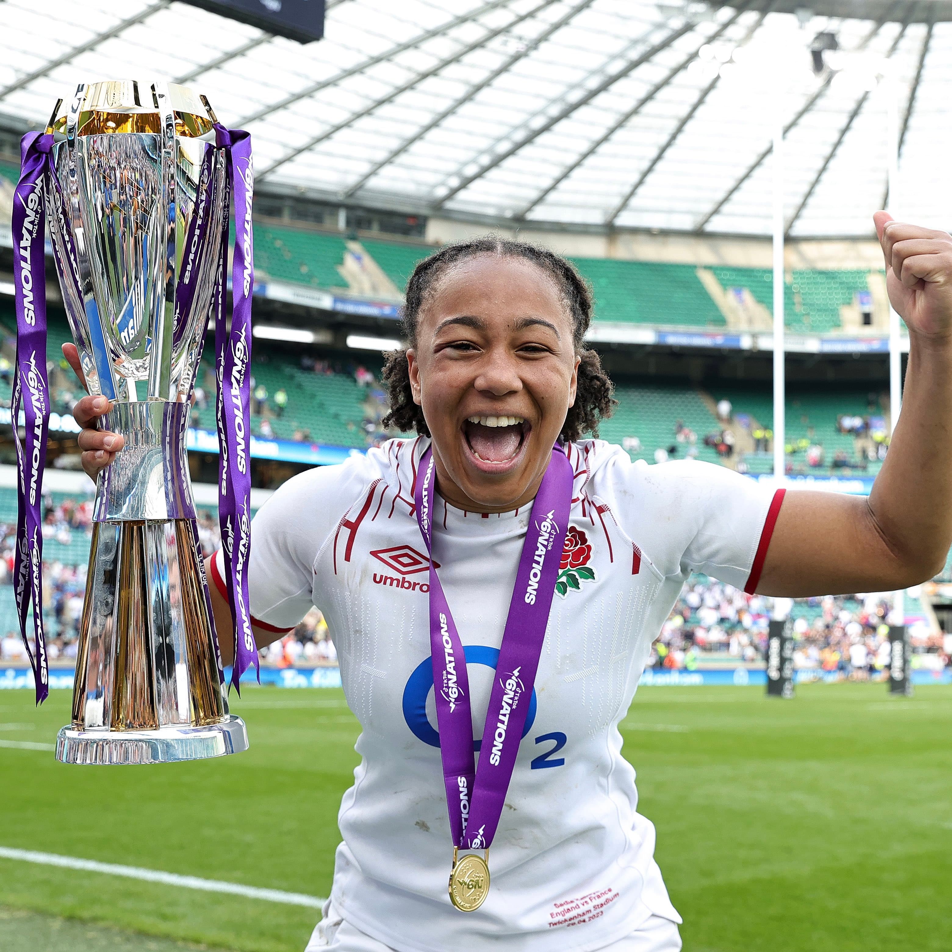 Sadia holding the Women's Six Nations trophy, after England won the title. Credit: Getty